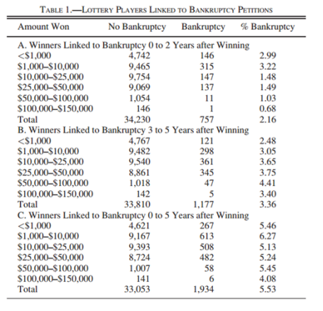 美国肯塔基大学、匹兹堡大学和范德堡大学的经济学家曾在一个研究中阐明过中奖者与破产率的关系。