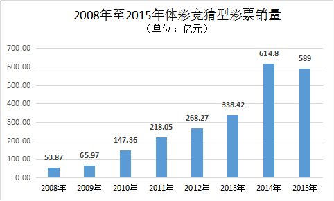 2009年,随着竞彩的上市以及在全国31个省份的全覆盖,竞猜型彩票的销量同样看涨。竞彩周销量屡超5亿元,竞彩店也遍布城市乡镇,竞彩店成了人们休闲、娱乐、看球、购彩的交流场所。2014年竞猜型彩票销量达614.8亿元,同比增幅高达81.66%。2015年竞猜型彩票销量为589亿,同比下降了4.19%。