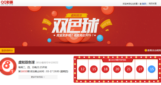 打开qq彩票网站,“虚拟投注双色球”游戏完全是仿照现实生活中相对应的场景,通过现金充值和签到得积分,再用积分进行投注,游戏中一注双色球需要用2个积分购买。如果与国家发行彩种玩法以及开奖结果完全一致即为中奖,所有奖级奖金都为积分奖励。