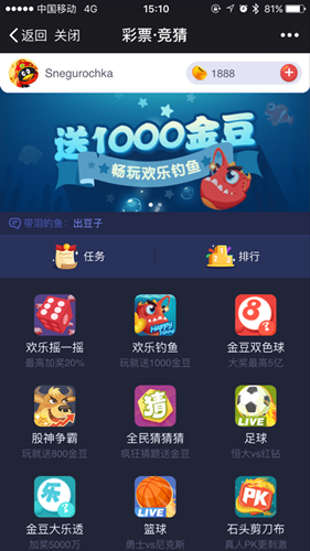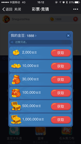随后笔者又玩了“石头剪刀布”和“欢乐摇一摇”游戏,但玩了几次就输光了所有金豆,在赠送的几次400金豆之外,金豆唯一的来源就是购买,购买价格是1000金豆=1元。