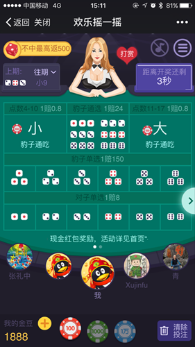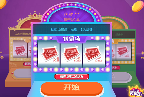 还有“全民啪啪乐”游戏,用户可消耗不同的积分参与初级场、中级场、高级场三个场次的抽奖,参与抽奖需要消耗场次按钮上的对应积分。贵宾场则需要5000点积分以上才能进入;用户按下“开始”按钮后,将消耗积分开始游戏。机器图标停止滚动时,若三个图标一致,代表用户获得该图标对应的奖励;若三个图标不一致,代表用户没有获得奖励。