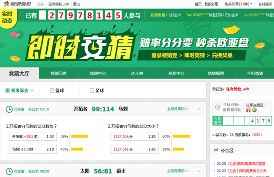新浪爱彩的即时竞猜游戏,笔者登录即可获得一定数目的猜豆,玩法有竞猜足球比赛中的胜平负以及总进球数等,还有竞猜篮球比赛中的让分胜负和大小分等滚球游戏。编者统计截止发稿前,已经有2797万人参与了爱彩即时竞猜游戏,可见该玩法之火爆程度。