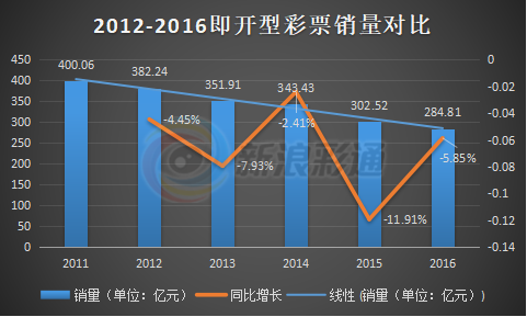 参照2012-2016的即开型彩票销量数据,2015年共销售302亿元,同比下滑11.91%,已成为近年之“最”。而今年前11个月,即开型彩票销量相比去年同期,更是下降12.5%,境遇极为尴尬。