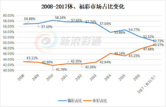 从走势图来看,2013年之前,体福彩市场占比一直相差15%左右,且走势较为平稳。此后,福彩的市场优势便被逐步缩小。截止到今年前11个月,体彩的市场占比已达到49.27%,只落后福彩50.73%的市场份额不到千分之五,可谓是势均力敌。