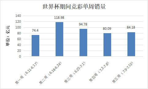 其中,第二周(6月18日-6月24日)卖出118.98亿元,打破了竞彩历史单周销量纪录。这使得本届世界杯在比赛进行的两周内就已超越上届销量总和。