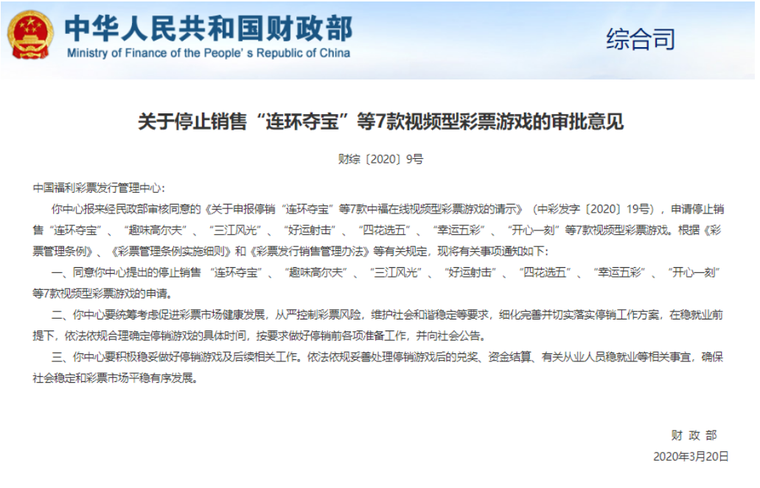 4月17日财政部公告,批准中国福利彩票中心主动发起的停止销售“连环夺宝”等7款视频型彩票游戏意见。对于彩票市场及相关从业者,如何去理解这一事件?