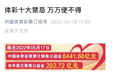 中国体育彩票官方5月19日发布消息《体彩十大禁忌!万万使不得》。其中提及体彩正朝着“负责任、可信赖、高质量发展”的目标不断向前。同时,罗列了十项官方认定应当禁止的体彩经营行为。